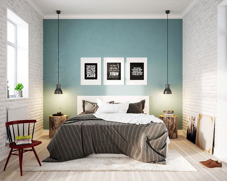 Tất cả chỉ nhằm một mục đích là hài hòa màu sắc, và tạo không gian tươi mới. Màu sơn tường phía chính diện cũng là sự phối hợp ăn ý với những chậu cây xanh nhỏ nhắn được đặt trong không gian phòng ngủ của căn hộ chung cư này. Đèn trang trí thả dây kiểu dáng tinh tế phù hợp với cá tính thể hiện của căn phòng ngủ phong cách scandinavian này.