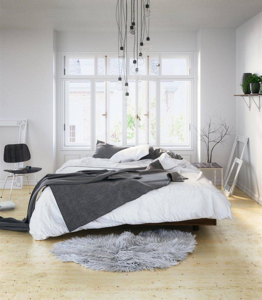 Phòng ngủ phong cách scandinavian sử dụng gam màu trung tính, dịu mắt mang lại không gian nghỉ ngơi thư thái. Trang trí bằng đèn thả dây độc đáo, cây xanh và thảm lông. Thảm lông mềm mại còn giúp không gian ấm áp hơn, sang trọng và tinh tế hơn.