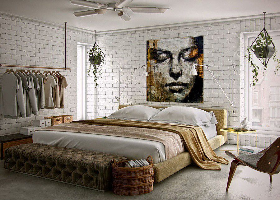 Nói đến những yếu tố Bắc Âu trong gian phòng này, bạn sẽ nhận thấy ngày bức tường ốp gạch thô sơn trắng tinh khôi, cùng với bộ chăn drap mềm và lạnh như những bông tuyết. Nhưng không thể hiến không gian lạnh lẽo bởi vì có sự góp mặt của nền sàn gỗ mộc và ánh đèn vàng ấm áp. Thảm trải sàn họa tiết mắt mắt, gam màu trầm tương phản cũng giúp cân bằng lại màu sắc.