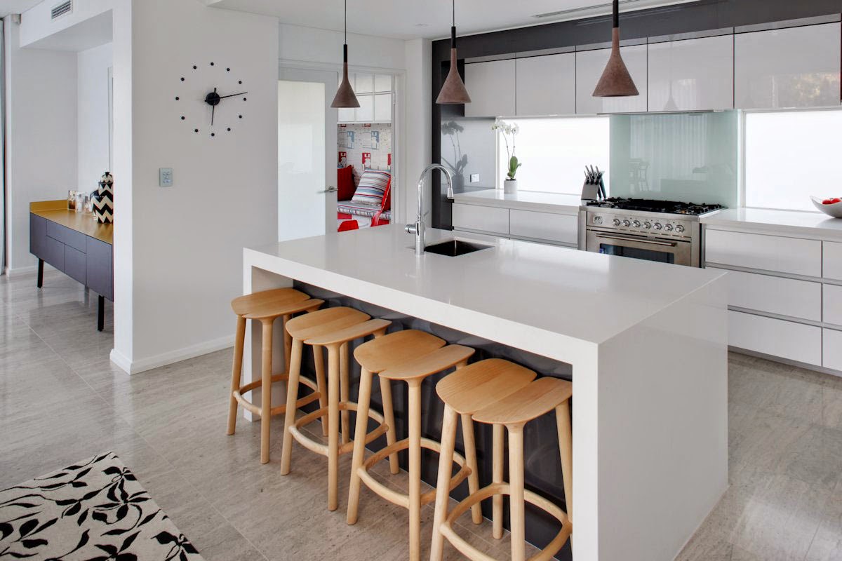 Sử dụng đảo bếp kết hợp với bar được xem là sự lựa chọn thông minh cho những không gian nhỏ, ưa thích cuộc sống hiện đại và tiện nghi. Kiểu bếp chữ L không phụ kiện tay cầm, cùng với hệ thống đèn chao kiểu thả giúp căn bếp tươi sáng và ấm cúng hơn.