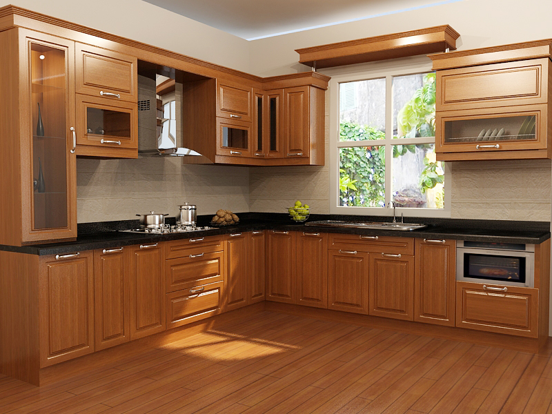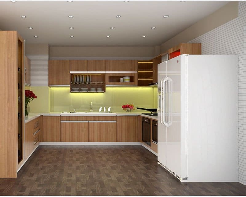 Gỗ tự nhiên vẫn luôn là lựa chọn số 1 của nhiều gia đình. Sự tinh tế trong tông màu, các đường vân mềm mại cùng với kiểu dáng thiết kế thanh thoát, đem đến mẫu nội thất phòng bếp đẹp hiện đại, được nhiều gia đình ưa chuộng. Kiểu bếp chữ L kết hợp với mặt đá và bàn tròn, hệ thống đèn trang trí thiết kể dạng thả với trần thạch cao giật cấp nhẹ, đem lại hiệu ứng mới và sức sống trẻ trung.