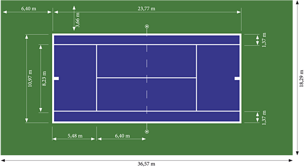- Tennis chơi trên sân hình chữ nhật, bề mặt phẳng. Chiều dài sân là 23,77 m, và chiều rộng là 8,23 m với trận đánh đơn và 10,97 m cho trận đánh đôi.